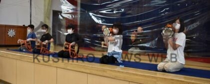 [写真/大鼓と小鼓で演奏の共演をする児童たち ]