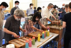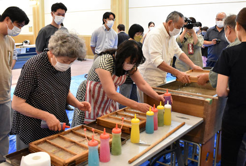 [写真/福西さんの指導で宇陀紙作りに挑戦する参加者 ]