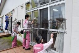 [写真/鳥取保育園の窓ガラスを清掃する職員たち ]