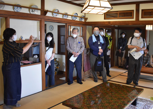 [写真/「旧五十嵐家住宅事務所兼主屋」で金子さん(左)の説明を聞く参加者 ]