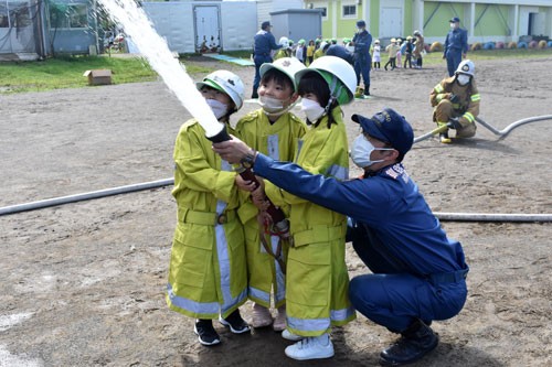 [写真/防火衣とヘルメットを身に着け、放水体験をする児童たち ]