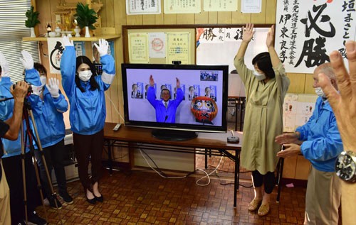 [写真/リモートで再選の万歳を行う画面中央の石垣氏とスタッフ ]