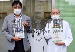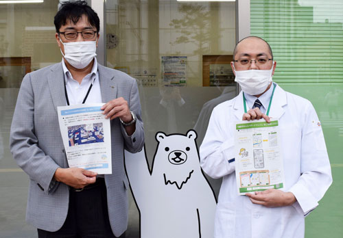 [写真/薬局内に掲示するポスターを手に林会長(右)と佐々木管理監 ]