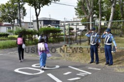 [写真/登校中の児童たちを敬礼しながら見守る釧路署員 ]