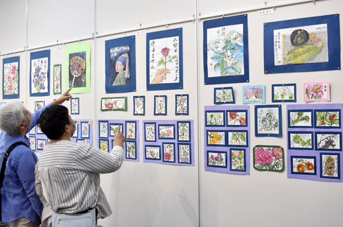 [写真/大小さまざまな絵手紙が並ぶ会場 ]