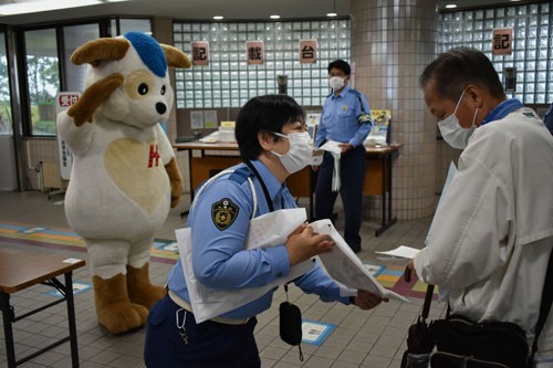 [写真/来場者に啓発グッズを手渡す警察官 ]