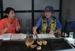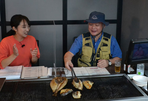 [写真/魚種や焼き方について解説する小松町長(右)と原田さん ]