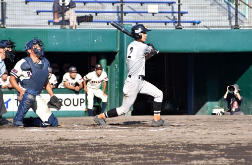 [写真/【1回戦、旭川龍谷―釧工業】9回に右前適時打を放つ釧工業の石垣。3安打2打点の活躍 ]
