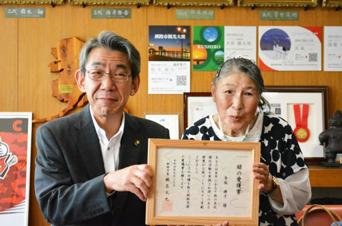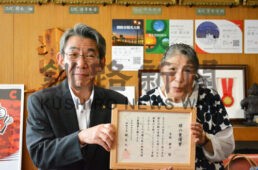 [写真/表彰状を手にする寺坂さんと蝦名市長 ]