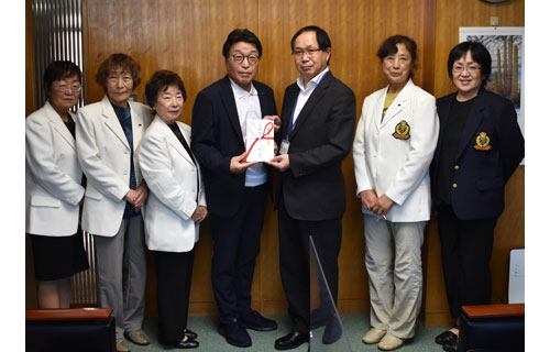 [写真/町に5万円を寄付した桜さん(左から4人目) ]