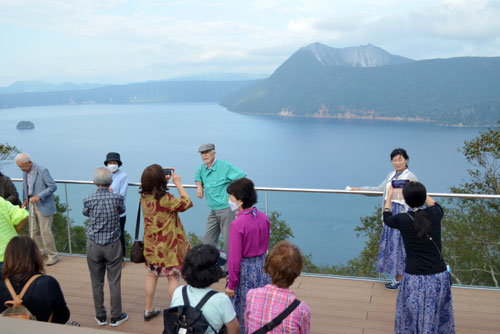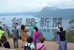 [写真/夏にオープンした摩周湖カムイテラスで記念撮影する旅行客。海外からの旅行客増加が期待される ]