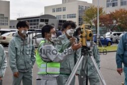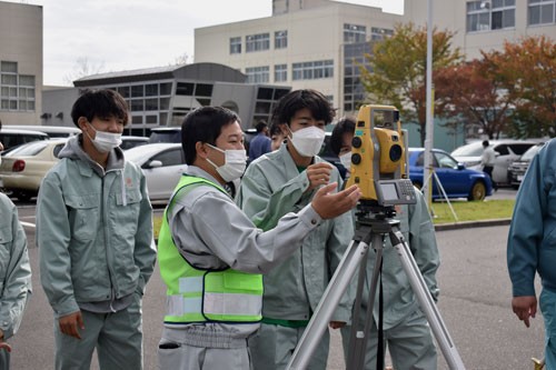 [写真/測量機器の使い方を体験する生徒 ]