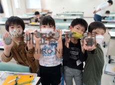 [写真/コンクリートで作った人気キャラクターを手にする子供たち ]