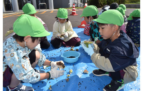 [写真/ヒマワリから種を取る園児たち ]