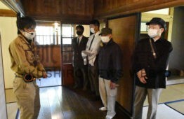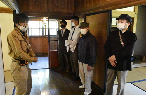 [写真/旧奥行臼駅逓所で戸田学芸員(左)の説明に耳を傾ける参加者 ]