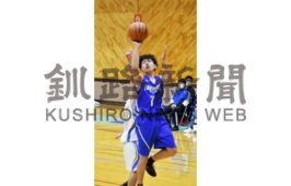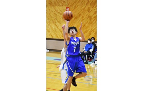 [写真/【男子決勝、釧鳥取西―釧路町富原】ゴール下で相手をかわし、レイアップシュートを決める釧鳥取西の小山内 ]