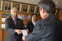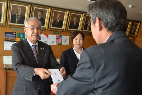 [写真/蝦名市長に目録を手渡す亀岡代表取締役(左)と仙道課長 ]