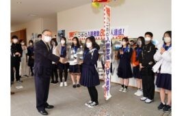 [写真/大阪府立夕陽丘高校の生徒らが見守る中、石垣市長から節目の記念品を受け取る綿田さん(右) ]