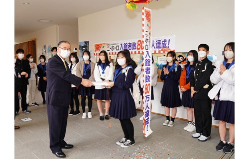 ニ・ホ・ロ入館者80万人達成 大阪の修学旅行生に記念品(2022-10-18)