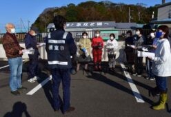 [写真/秋の全市一斉清掃後、防災出前講座を受ける長谷川会長(左端)ら汐見町会員 ]