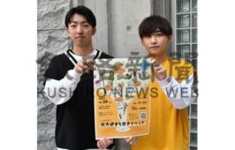 [写真/ポスターを手に参加を呼び掛ける松原代表(左)と及川瑞貴副代表 ]
