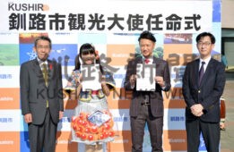 [写真/釧路市観光大使に任命された秋葉さん(左から2人目)と尾越さん(同3人目) ]