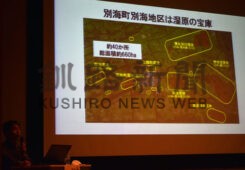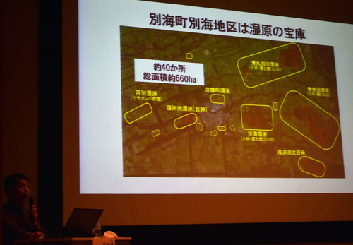 [写真/ムセンスゲが宮舞町湿原のほか少なくとも7カ所で確認されたことを発表する齋藤さん(23日) ]