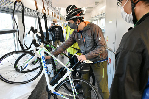 [写真/自転車を車両に積み込むモニター調査参加者 ]
