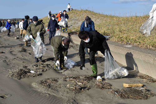 [写真/海岸に流れ着いたごみを拾い集める根室市民 ]