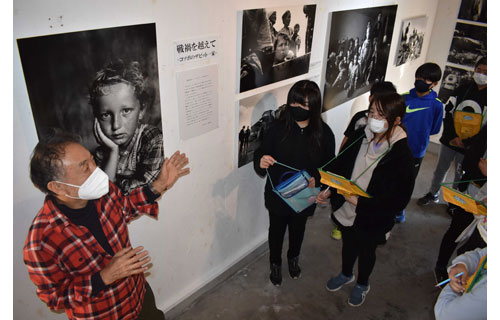 [写真/ギャラリーで児童たちに海外の事情を説明する長倉さん(左) ]