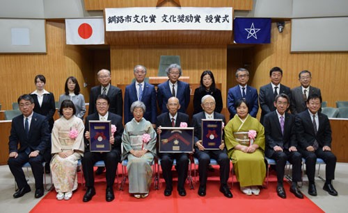 [写真/文化賞を受賞した北畠氏(前列中央)、文化奨励賞を受賞した石田氏(同右)と釧路市民吹奏楽団の小野団長(前列左から3人目) ]