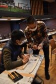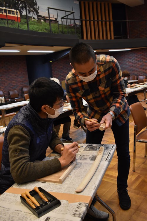 [写真/参加者に丁寧に彫り方を指導する藤戸氏(右) ]