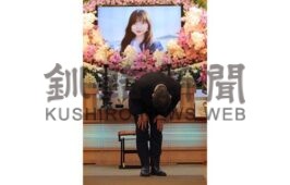 [写真/芽生さんの遺影の前で参列者に深々と頭を下げる父親の歩さん(6日午後8時すぎ)=代表撮影 ]