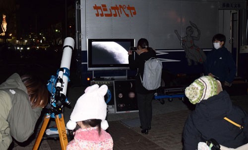 [写真/望遠鏡やモニターで月の様子を楽しむ来場者 ]