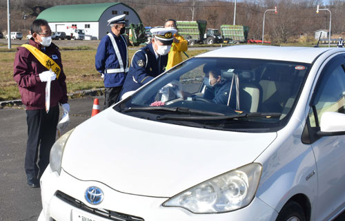[写真/ドライバーに安全運転を呼び掛ける井元署長(右)と佐藤町長 ]