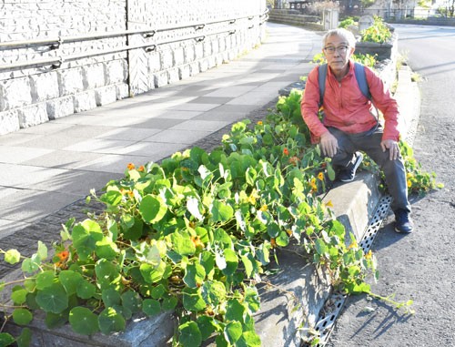 [写真/覆道部のキンレンカの前で大島代表 ]