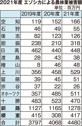 21年度鳥獣被害 エゾシカで44億8000万円、釧路管内は12億円超(2022-11-21)