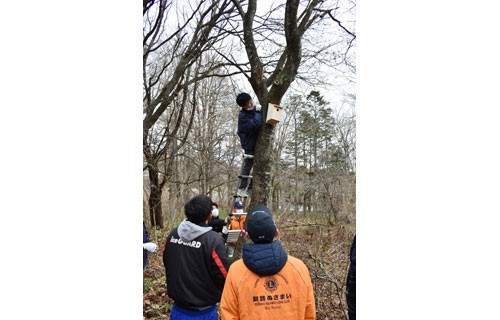 [写真/新しい巣箱を木に取り付ける参加者 ]