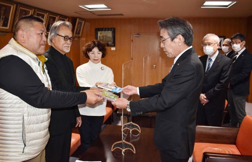 [写真/蝦名市長(中央)に写真集とCDを寄贈する山本さん、木下さん、上さん(左から) ]