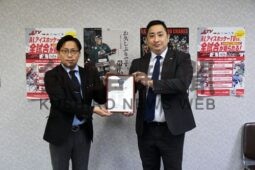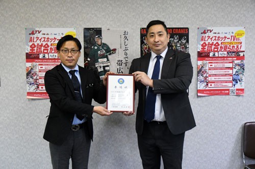 [写真/広報大使の委嘱状を渡した飯嶋課長と清川GM(左から) ]