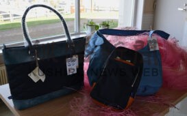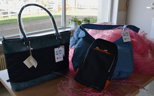 [写真/廃漁網から生まれ変わった「豊岡鞄」の製品。町内では厚岸味覚ターミナル・コンキリエで販売 ]
