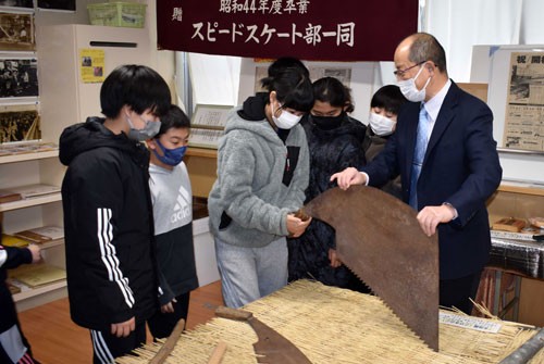 [写真/一本嶋さん(右端)から昔の道具について説明を受ける児童たち ]