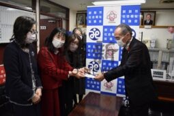 [写真/土井会長に寄付金を手渡す穂積会長(左から2人目) ]
