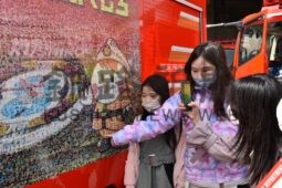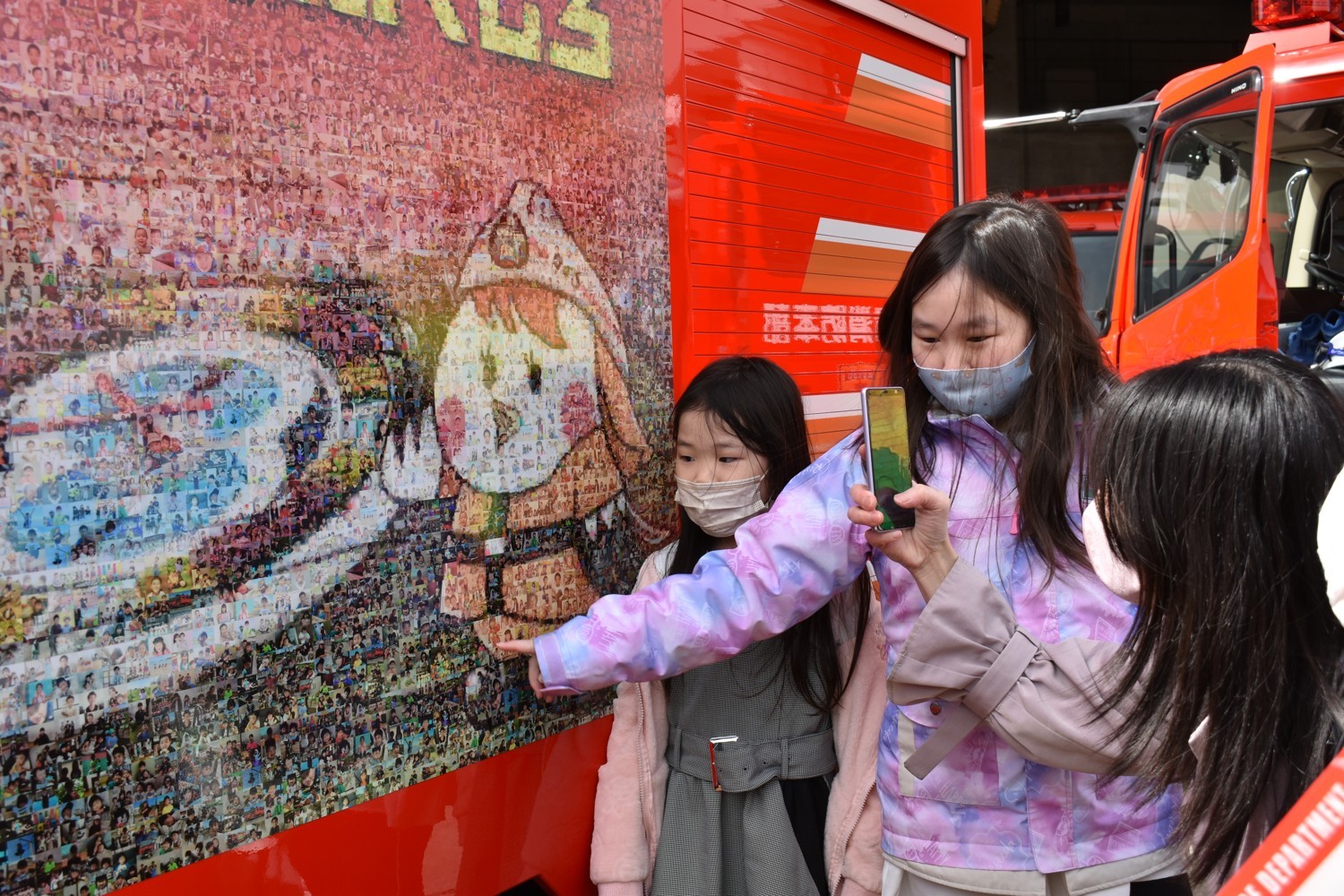 モザイクアート消防車お披露目 記念撮影、見学楽しむ(2023-03-26)
