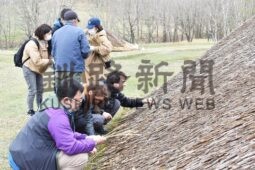 [写真/屋根ふきを楽しむ参加者たち]