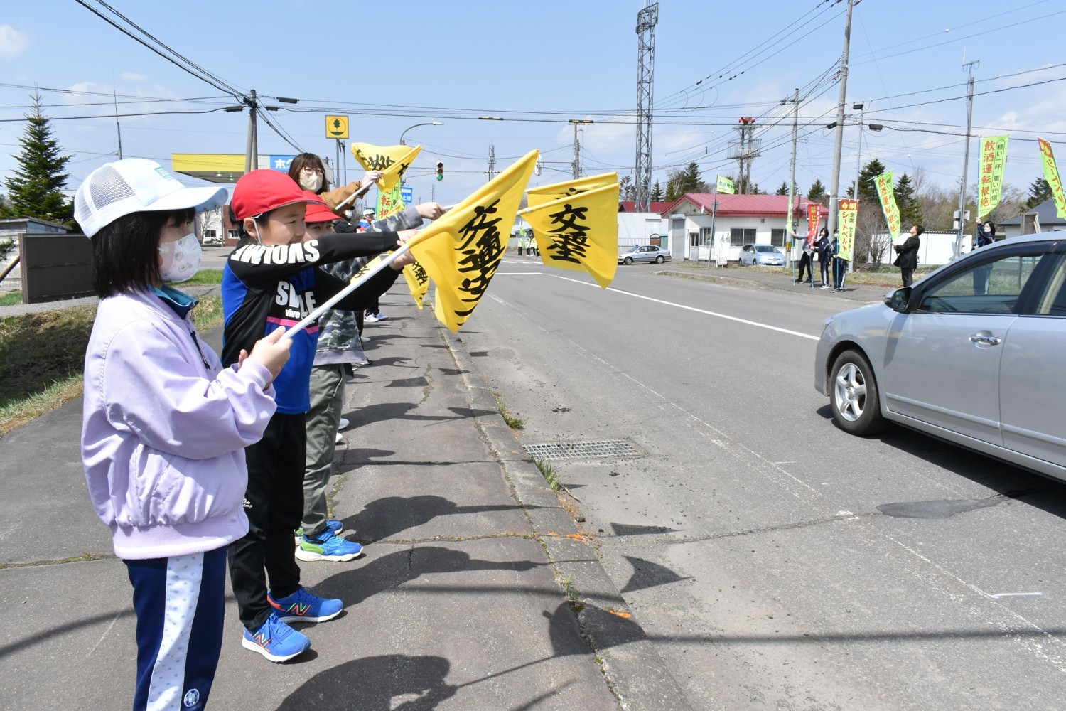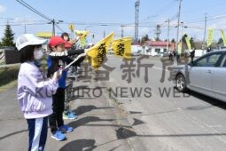 [写真/旗を振りながら安全運転を啓発した児童生徒たち]