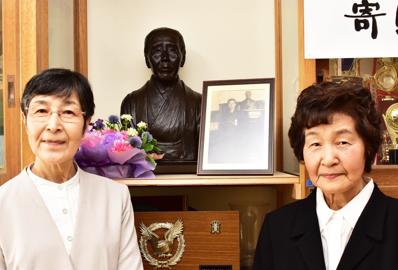[写真/花咲小に所蔵された成田隆さんの銅像と孫の本村彰子さん(右)、渡邊ゆみさん]