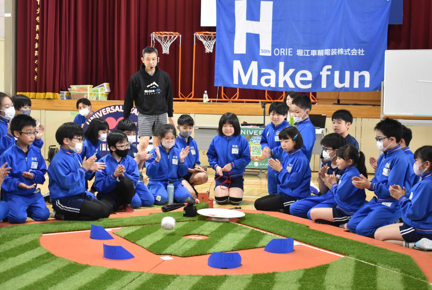 [写真/中村さん(後部)の指導でユニバーサル野球を楽しむ児童たち]