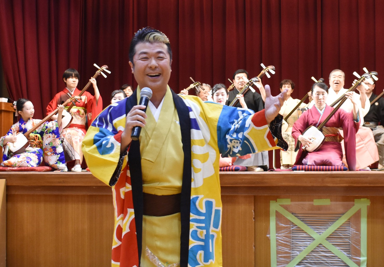 [写真/三味線合奏をバックに登場した義貴さん]