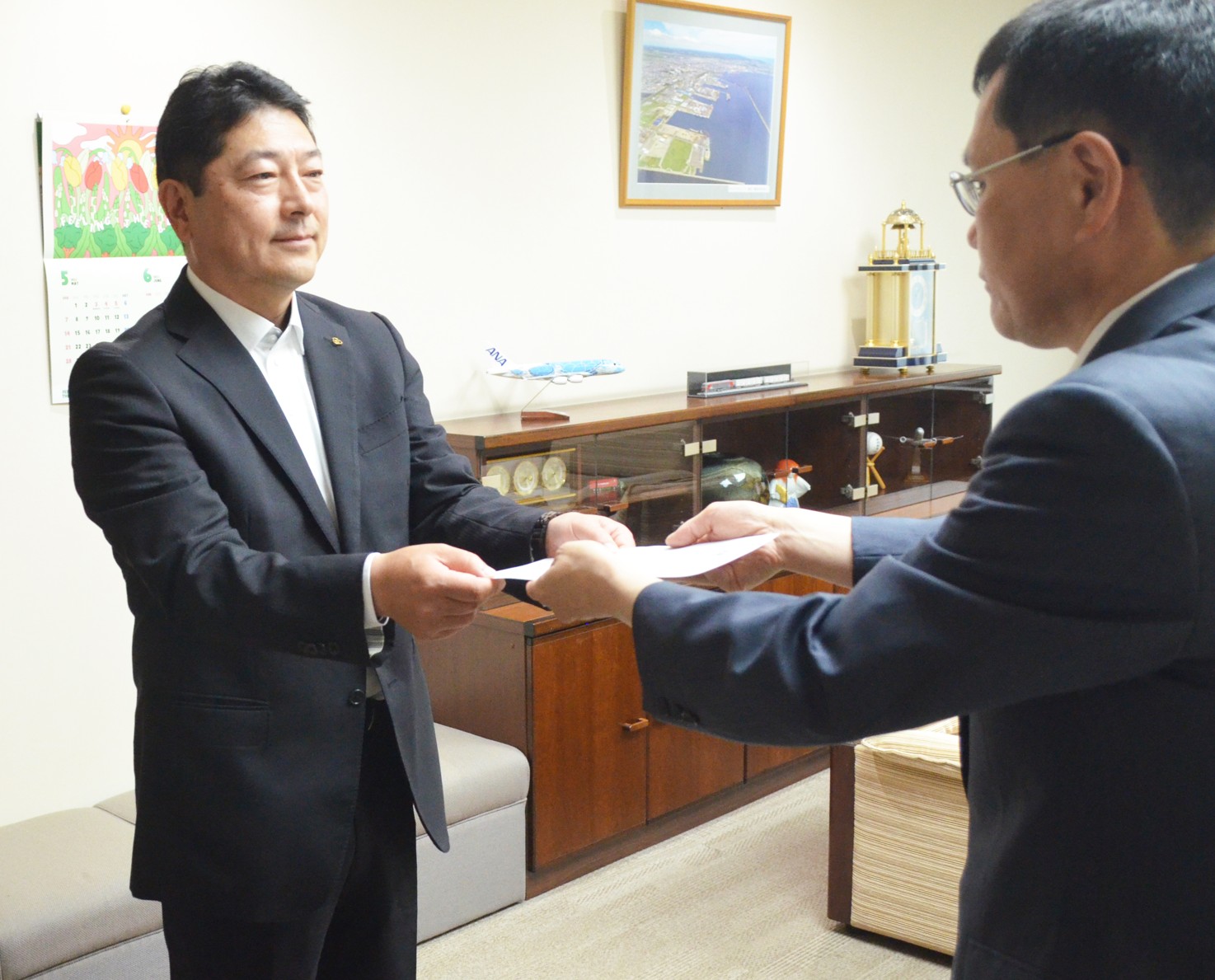 [写真/瀬下室長から交付書を受け取る岩川部長(左)]